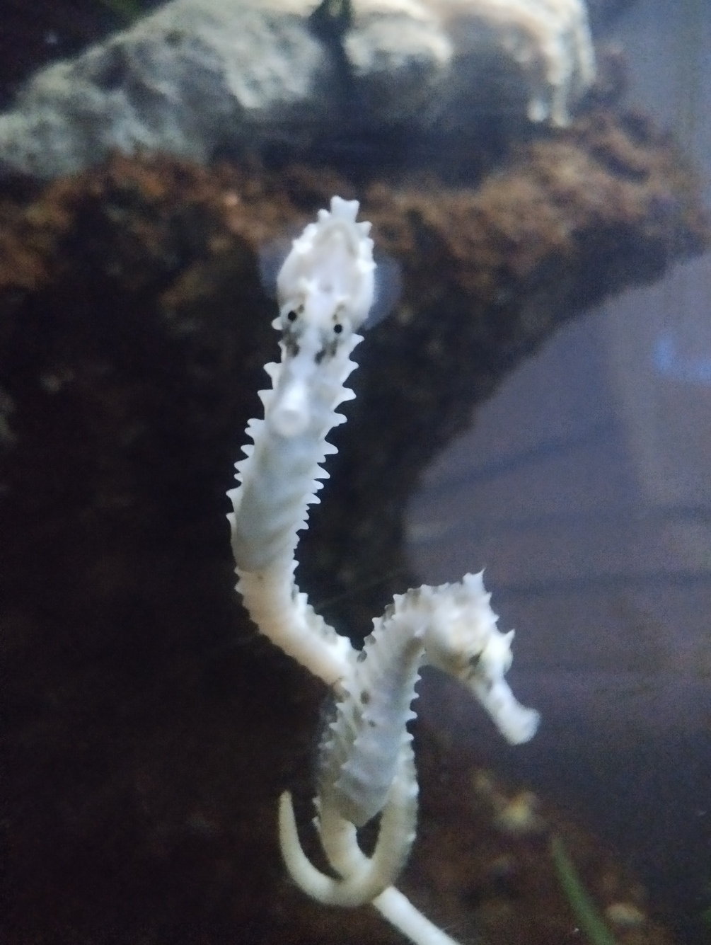 A picture from a local acuarium. You can see two seahorsees, one of them is looking directly to the camera.